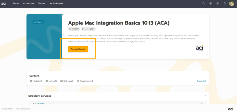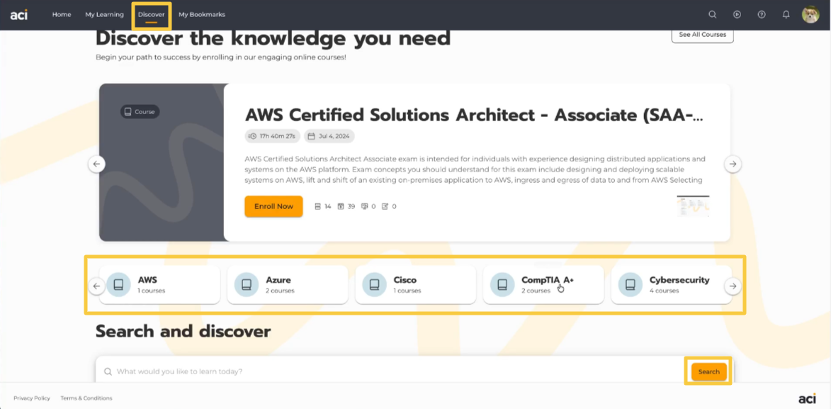 Once you have logged into your MyACI account, click on the Discover tab in the header menu to explore the Course library. From the Discover tab, you can view Courses by categories or use the Search function to find Courses you're interested in.