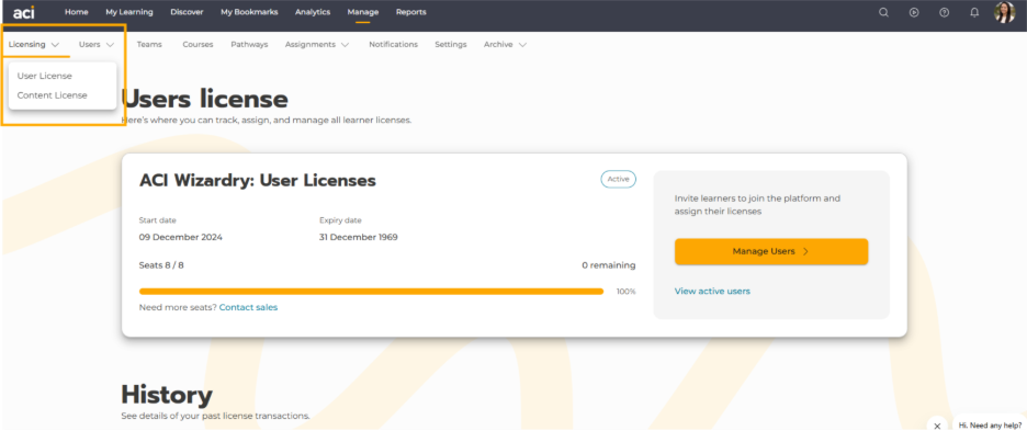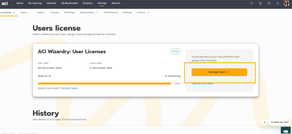 To verify if you have assigned a license to the User, log into your MyACI account and select Analytics to access the Admin Dashboard.