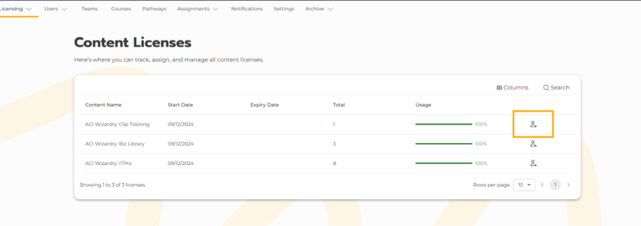 Select the line item to view all assigned users. Select the icon to assign a license.
